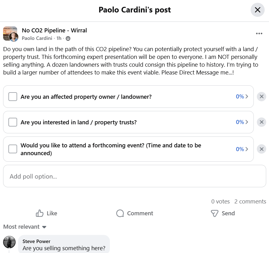 I’ve been in touch recently with a professional lady who is an expert in the provision of land and property trusts. Signing your property and land into a protective trust can prevent outsiders (such as Peak Cluster) from making impositions into your life and unwanted inroads into your family estate, such as the laying of a carbon capture pipeline through your land.