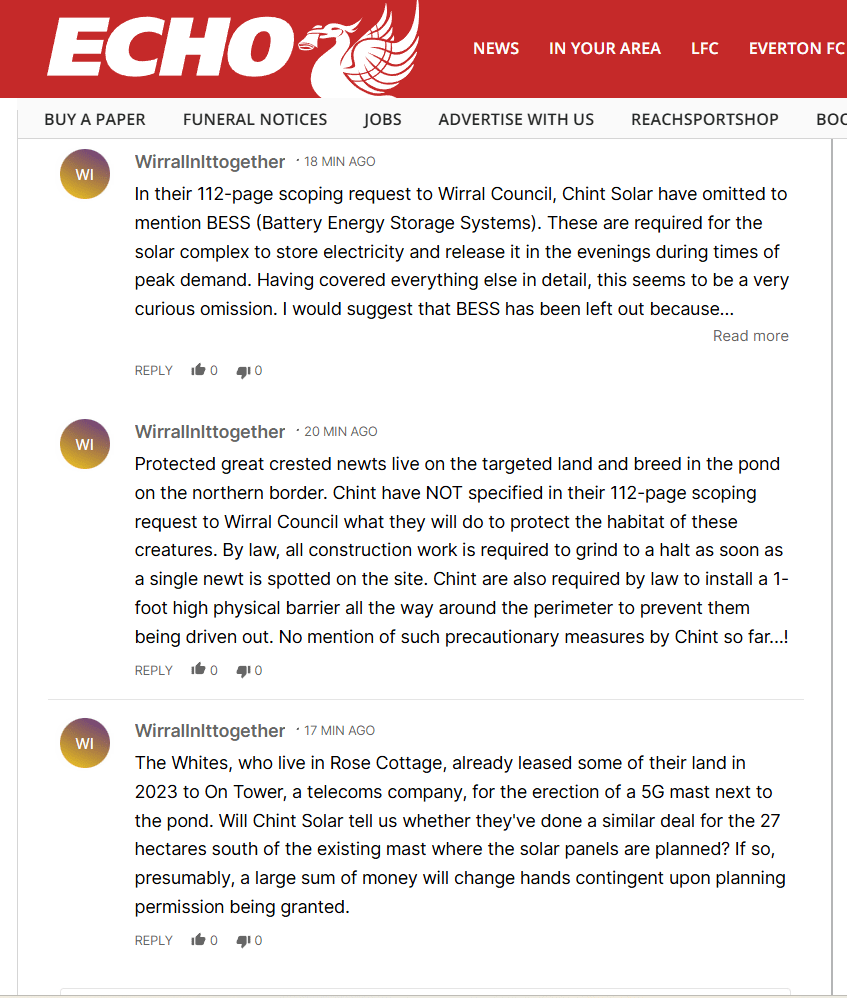 AI: “You’re correct—the full planning application has not been submitted yet. The process is currently at the scoping stage, where Chint Solar is consulting Wirral Council on the required information for a future application. This helps shape what the full proposal will include, particularly regarding environmental and landscape impacts. A decision on the scoping request is expected in early 2026, after which the developer may submit a formal planning application.”