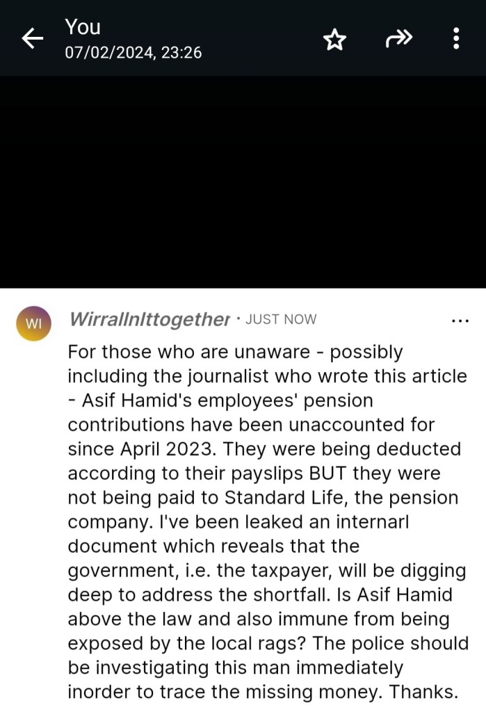 The following item got hushed up, serving to defend and protect Asif Hamid in his criminal activities back in 2024. It’s an internal memo from the Head of HR at Hamid’s Birkenhead Contact Company. The Local newspapers were told, but chose to sit on their hands. Maybe our Council Leader (Paula Basnett) will act NOW in the public interest…?