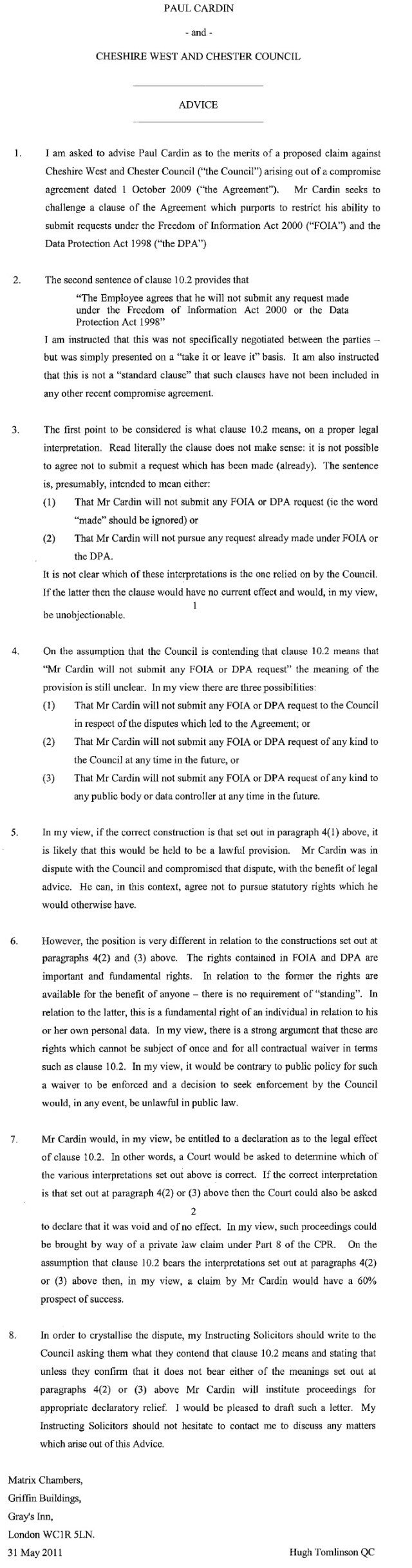 17 Responses to Opinion of Senior Counsel, Hugh Tomlinson QC, on Freedom of Information ban by Cheshire West and Chester Council –
