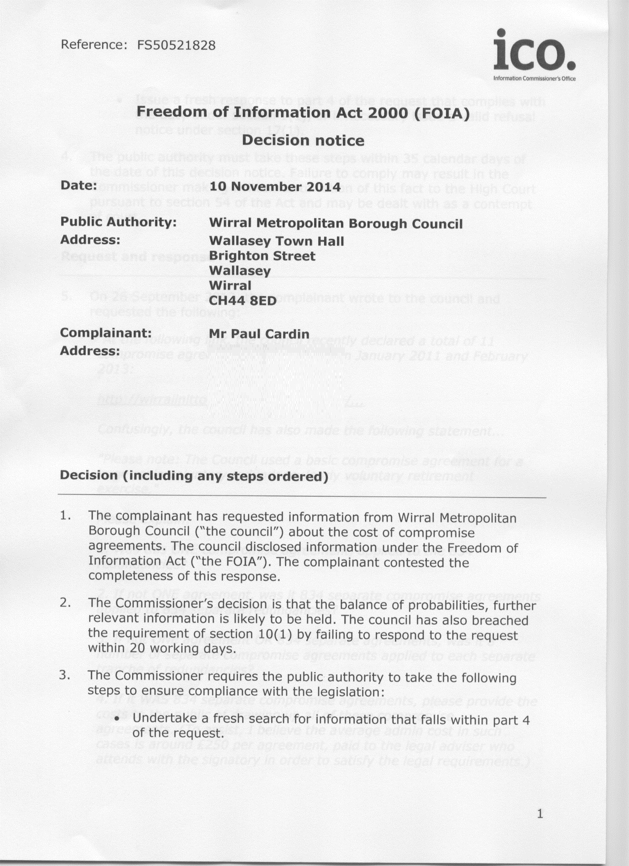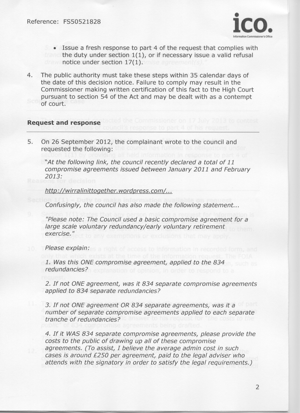 15 months ago, I placed the following FoI request with Wirral Council. It’s a pretty straightforward query, asking them about the public money cost of their compromise agreements – those desperate gagging clauses that shut people up before they finally move beyond your ‘sphere of influence’.
