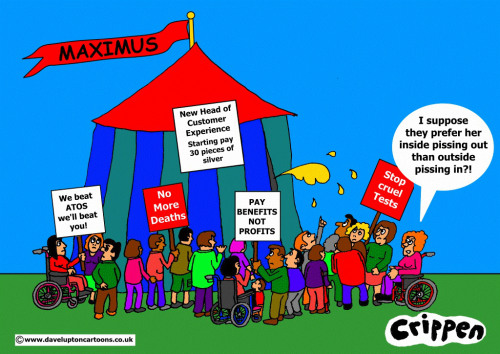 Has Sue really thought this through? Apparently she has, and my guess would be some seventy five thousand times! Course, Im certain this good lady will justify this step change of opinion and proclaim that people who come under the gaze of Maximus will always come first. Yes, first! Joint bloody first every single time. Neck and neck with the profit margins of Maximus who, through cunning, guile and downright corporate greed that saving the public millions and making themselves hundreds of thousands of pounds of public money, is a wonderful and entirely good arrangement that only goes to helping and easing the pain of the weak and the vulnerable and those who didn’t have the entrepuniarel good sense to create a political blog and eventually cash in on the notoriety that once made you a thorn in the side to the current Governmental incumbents.