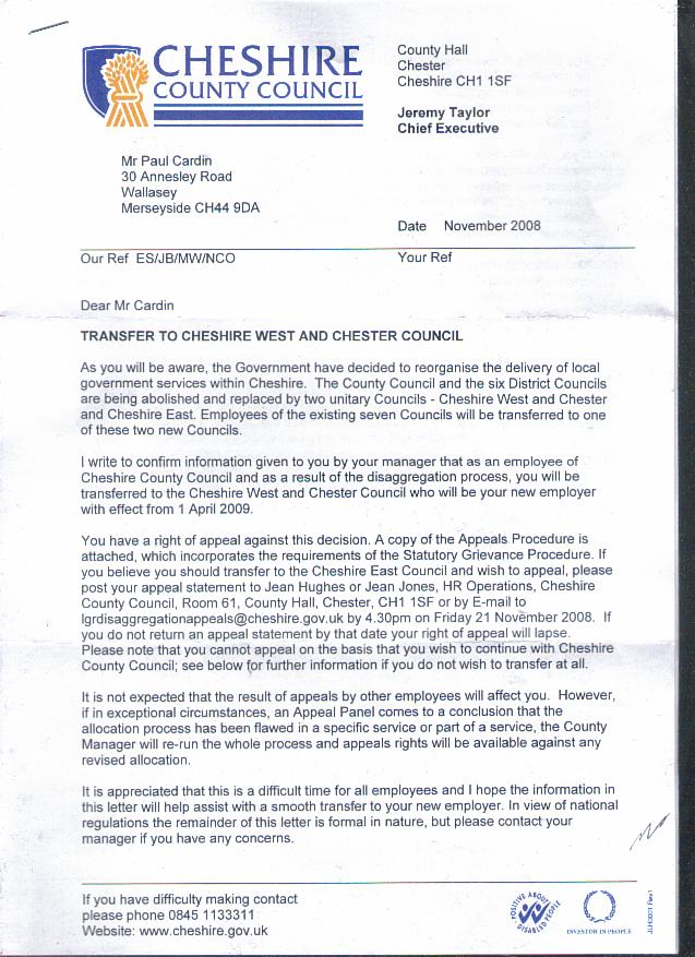 Cheshire County Council to be split in two. This arrived 10 months before we wiped the floor with our last employer 11 years ago