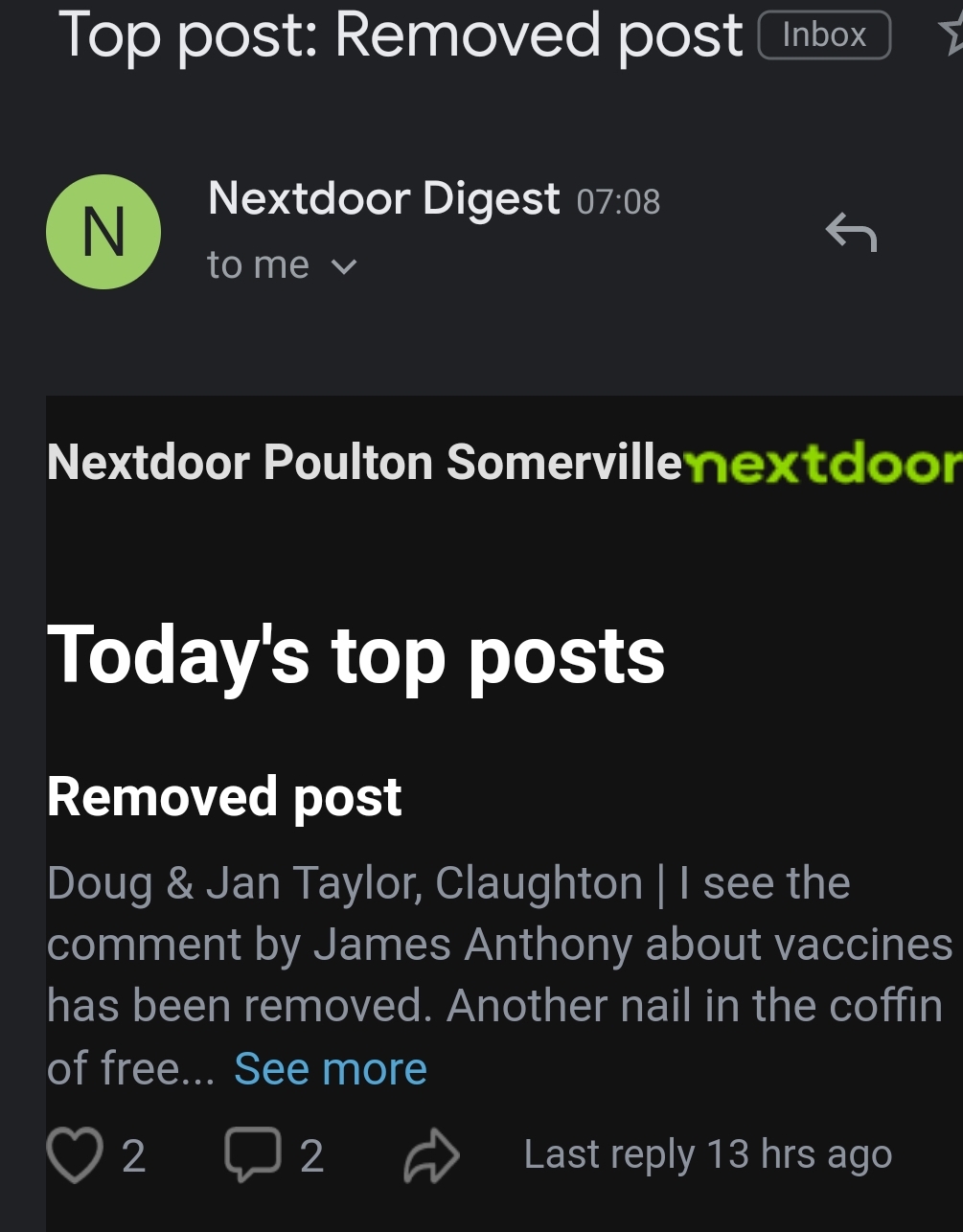 A comment complaining about attacks on free speech, er… gets removed. By NextDoor Digest, your friendly, local community channel.