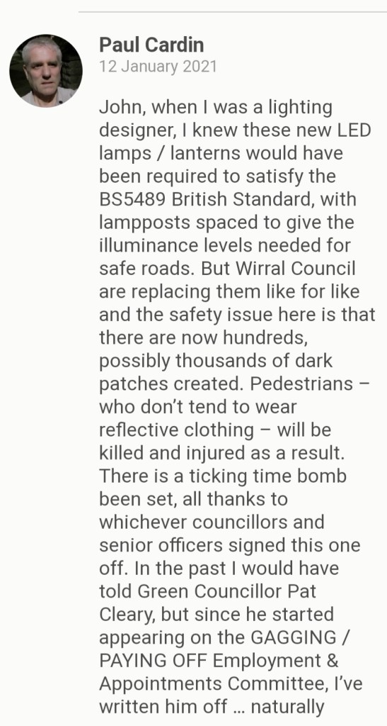 The question here for Wirral’s councillors and senior officers was a multi-faceted, economic one. Do we invest £millions undertaking safe street lighting designs which would entail the massive extra cost of removing thousands of old, redundant lampposts and lanterns, and installing new ones, but would provide safe streets for cars and pedestrians? Or do we ignore the British Standard, cut corners, avoid having to switch off street lights at night, save £millions and accept that men, women and children are going to be killed and injured?