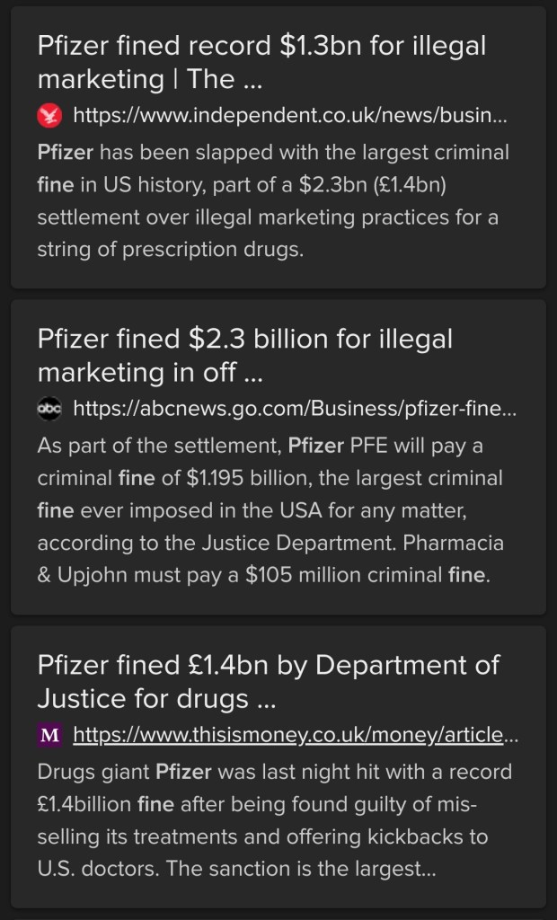 …remain free to make an immense fortune from Covid19 vaccines in the short term. The malignant Pfizer history on anti-trust, criminal, unethical conduct is the clearest possible evidence that public health and wellbeing were never uppermost.