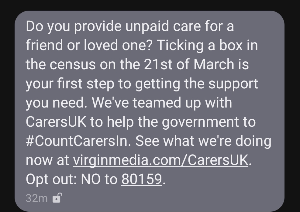 We’ve just received a highly unusual message from private telecoms company Virginmedia. It’s on the subject of unpaid care for friends and loved ones. Companies such as this have certain priorities. Caring is not one of them. Please exercise caution ⚠️ if you contact them. That’s our advice. Thanks 😑