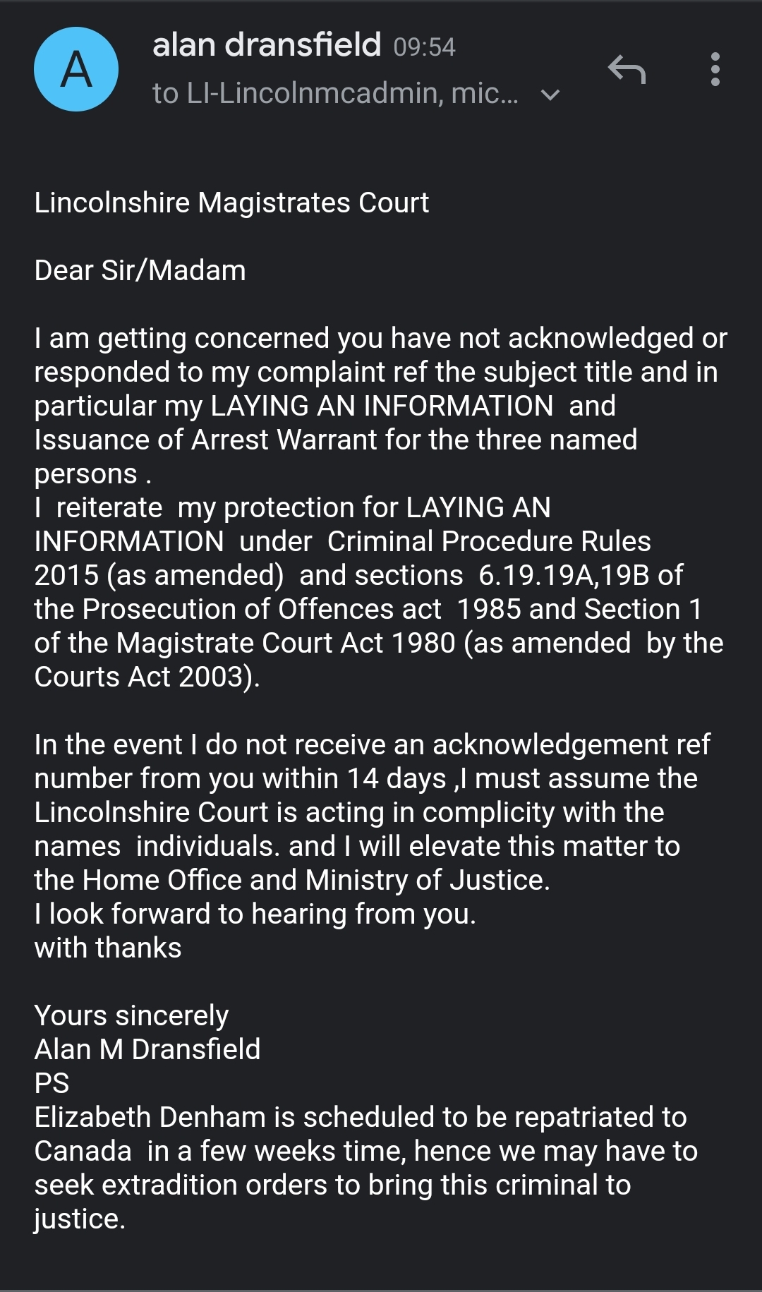 Follow up to the laying of information against perceived UK criminals