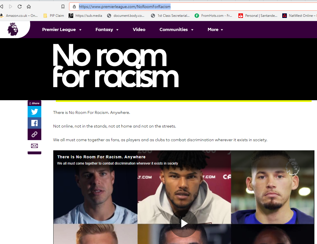 HYPOCRISY WRIT LARGE … A Message From the Website of The UK Football Premier League: THERE IS NO ROOM FOR RACISM. But……………….