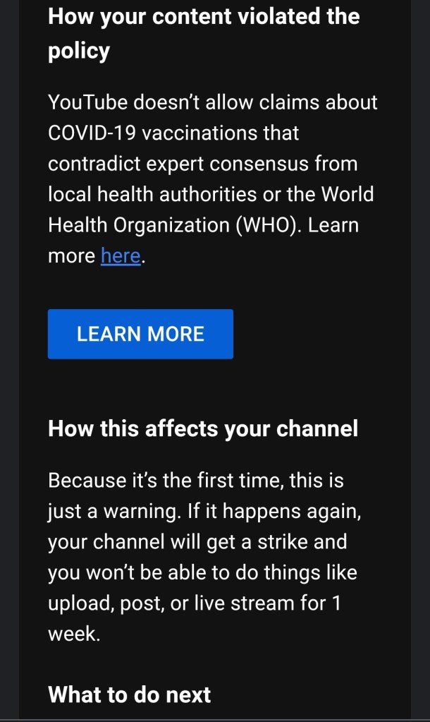 The offending content is a video by a number of qualified doctors who make different professional observations to those of medically unqualified IT professionals at Google. In years gone by, this would have been classified as mature debate, part of the customary ebb and flow of facts and opinion, and would never have been obliterated by a bludgeoning hammer of censorship!