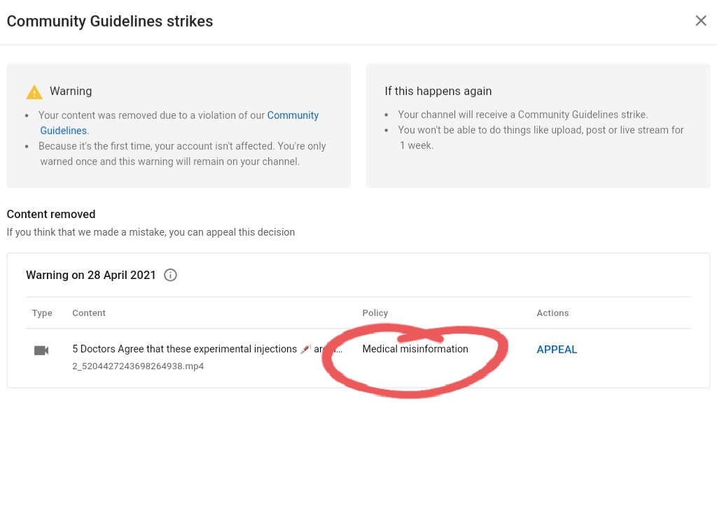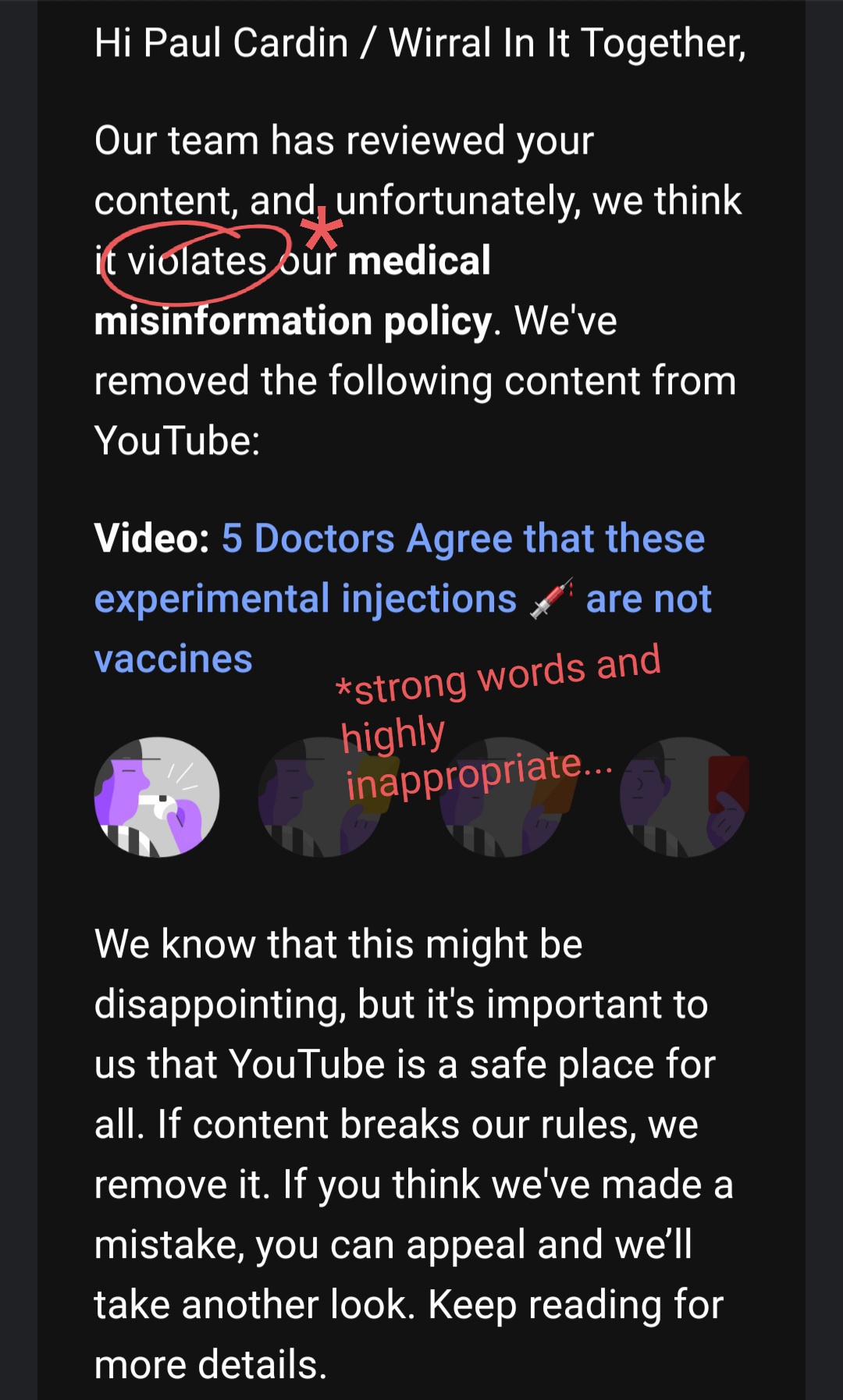 The offending content is a video by a number of qualified doctors who make different professional observations to those of medically unqualified IT professionals at Google. In years gone by, this would have been classified as mature debate, part of the customary ebb and flow of facts and opinion, and would never have been obliterated by a bludgeoning hammer of censorship!