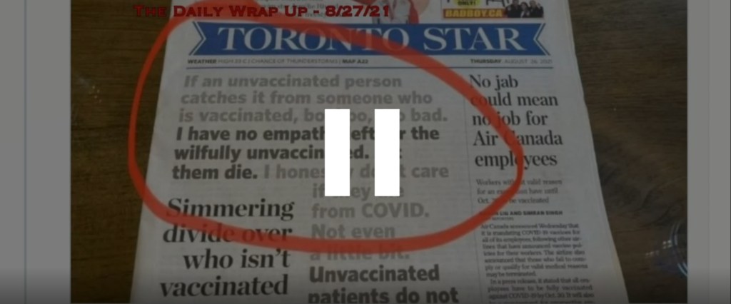 The Toronto Star, A Western Newspaper. We Quote … “If an unvaccinated person catches it from someone who is vaccinated, boo hoo, so sad. I have no empathy left for the wilfully unvaccinated. Let them die. I honestly do not care if they die from Covid. Not even a little bit…”