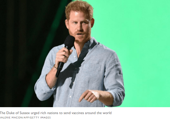 Wearing a black tuxedo, the Duke of Sussex said that “we are all at risk” until everyone can access the vaccine. He also criticised “mass-scale misinformation” for vaccine hesitancy, and admonished “news media and social media” for spreading falsehoods.