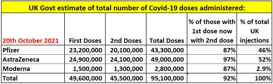 Latest UK Covid-19 injections administered in the UK to 20th October 2021 – per the UK govt