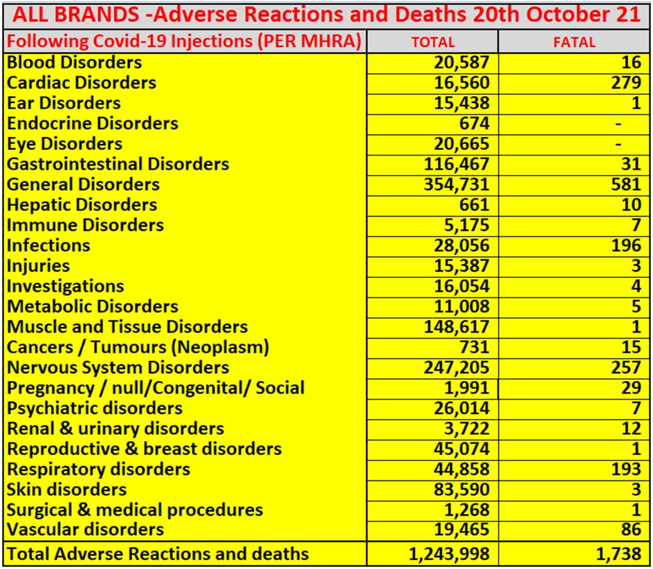 Table Above shows UK latest adverse reactions and fatalities reported to and disclosed by the MHRA to 20th October (released by the MHRA on 29th October 2021) for all UK Covid-19 injection manufacturers