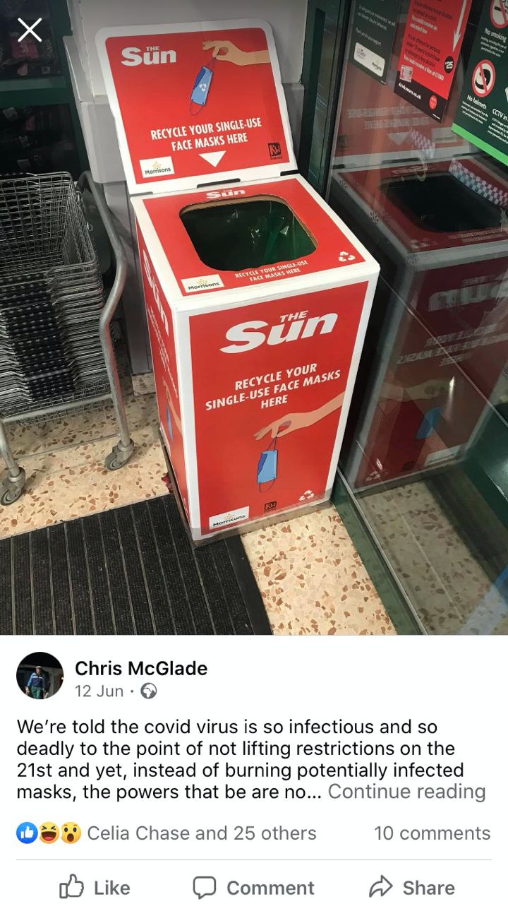 Why aren’t the owners of Morrisons supermarkets afraid of covid 19? Why have they been putting cardboard recycling boxes, sponsored by the Sun newspaper, for facemasks, potentially infected with a lethal virus that kills people, in their packed supermarkets where we buy our food?