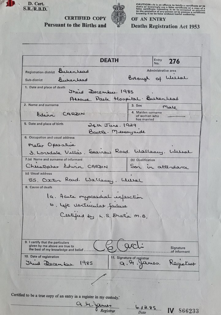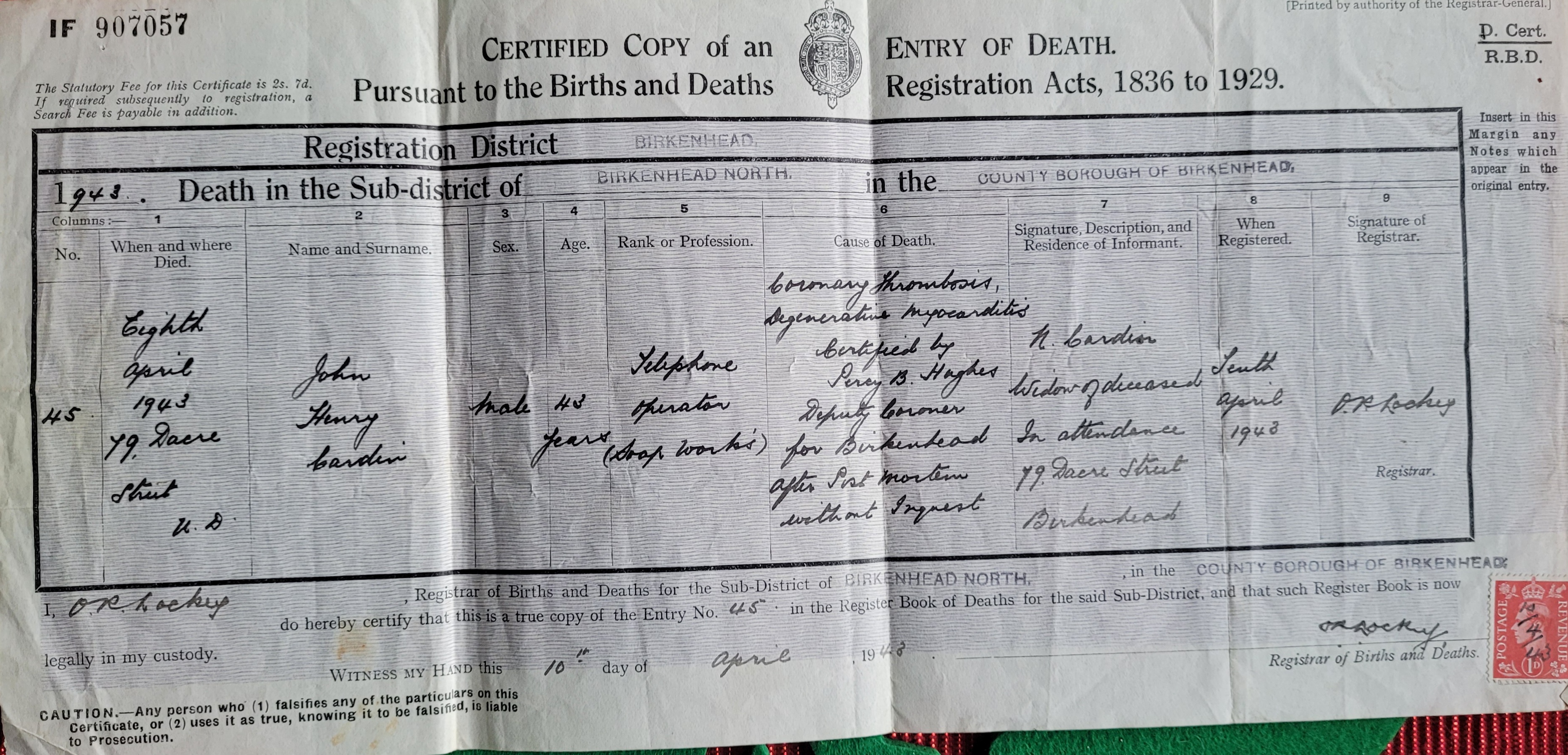 And his father – my grandfather – died aged 43 in 1943 from coronary thrombosis and degenerative myocarditis: