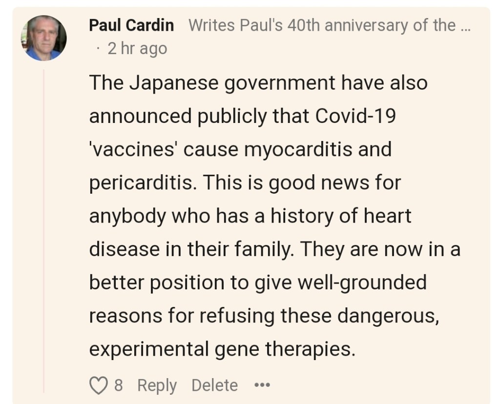 When I say ‘heightened risk of dying’ I mean the pericarditis and myocarditis which are potential adverse events caused by the injections, both of which impact the heart and have been described to the people of Japan as possible outcomes by their own government: