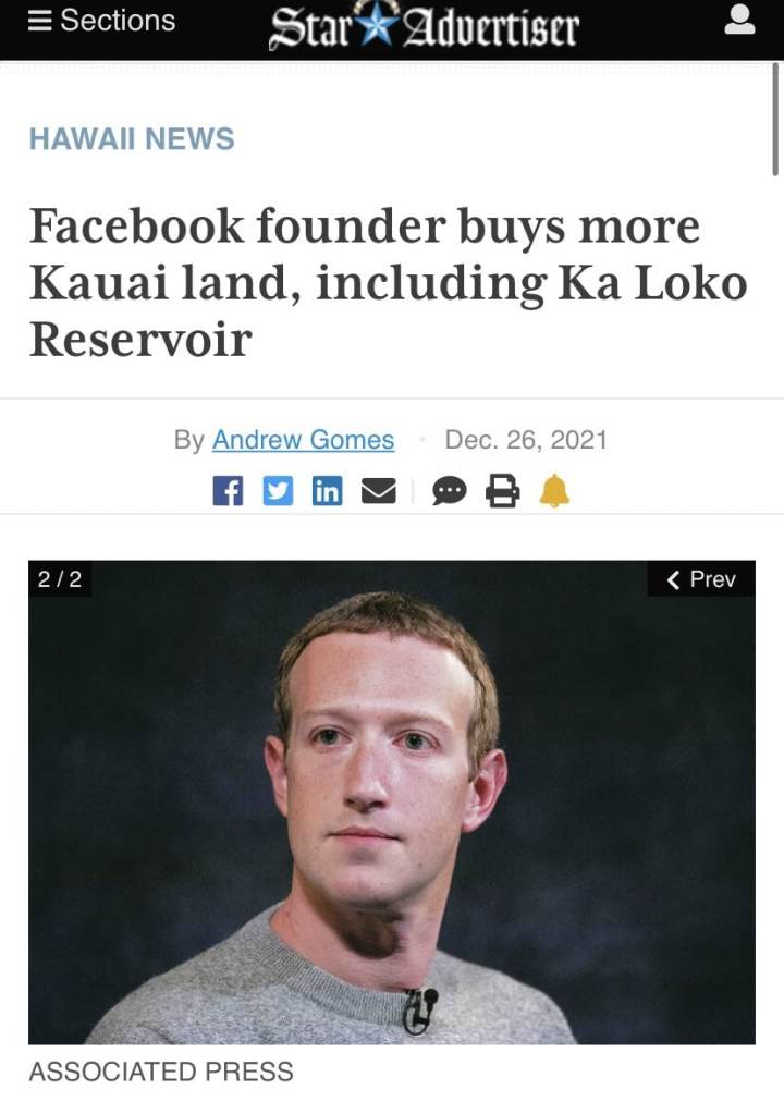 NEW – While billionaire Zuckerberg creates the “Metaverse” for the plebs, he just grabbed 110 acres more land on Kaua’i, including an important water reservoir, for his 1,300 acres private real-world island paradise.