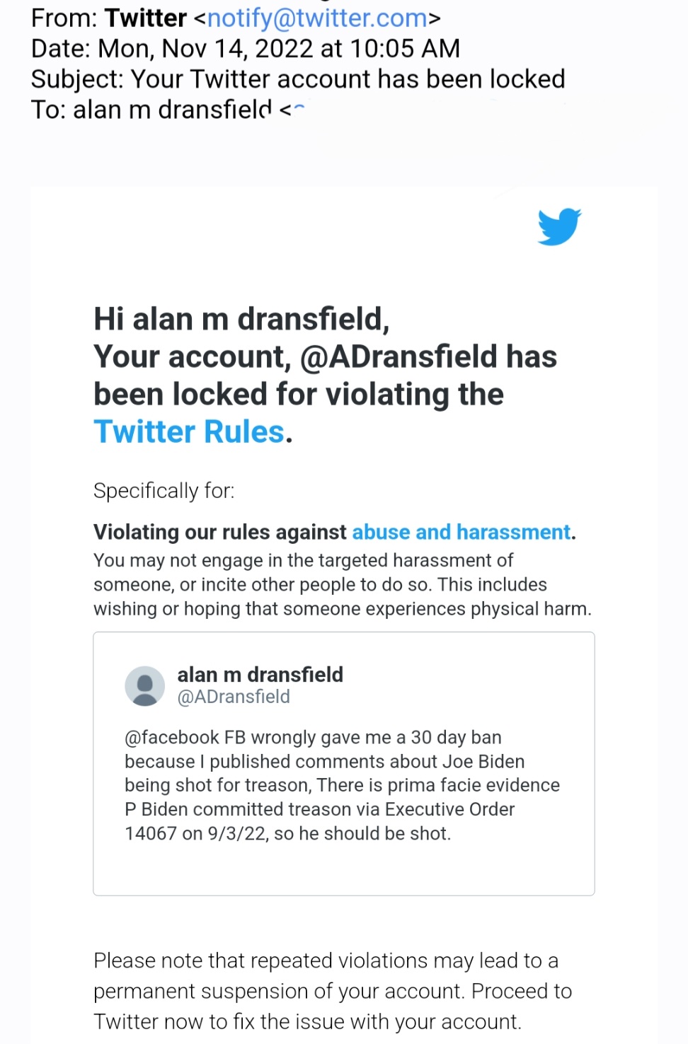 Needless to say I have appealed the Twitter ban and I refute their claim of abuse and harassment. I had made reference to a FACT ie President Biden had committed TREASON with his executive order 14067 on the 9/3/22 ref his intention to SCRAP the Dollar for the new Central Bank Digital Currency.In essence Joe Biden has unlawfully circumvented the US Constitution via bypassing the Congress and Senate