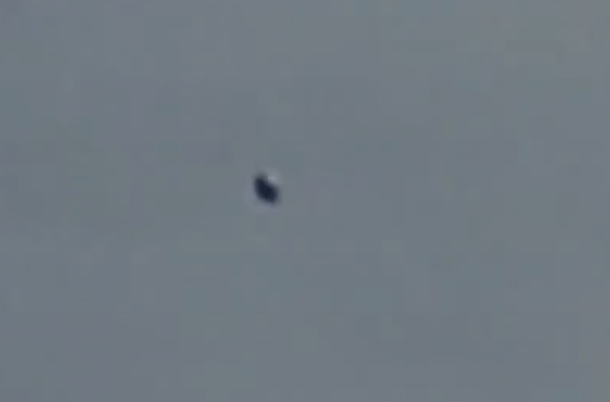 I froze the video, zoomed in and found this at around 12 seconds in, which looks like some sort of indistinct, cone-shaped craft with a dark, circular base …