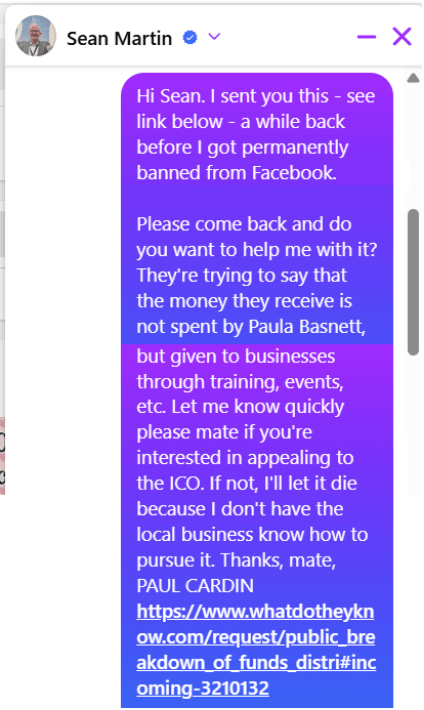 Why has it gone tits up? Well, Sean Martin isn’t answering my Facebook messages. I asked some time ago, before my Facebook account was permanently disabled, whether he’d like to assist me with the FOI request.