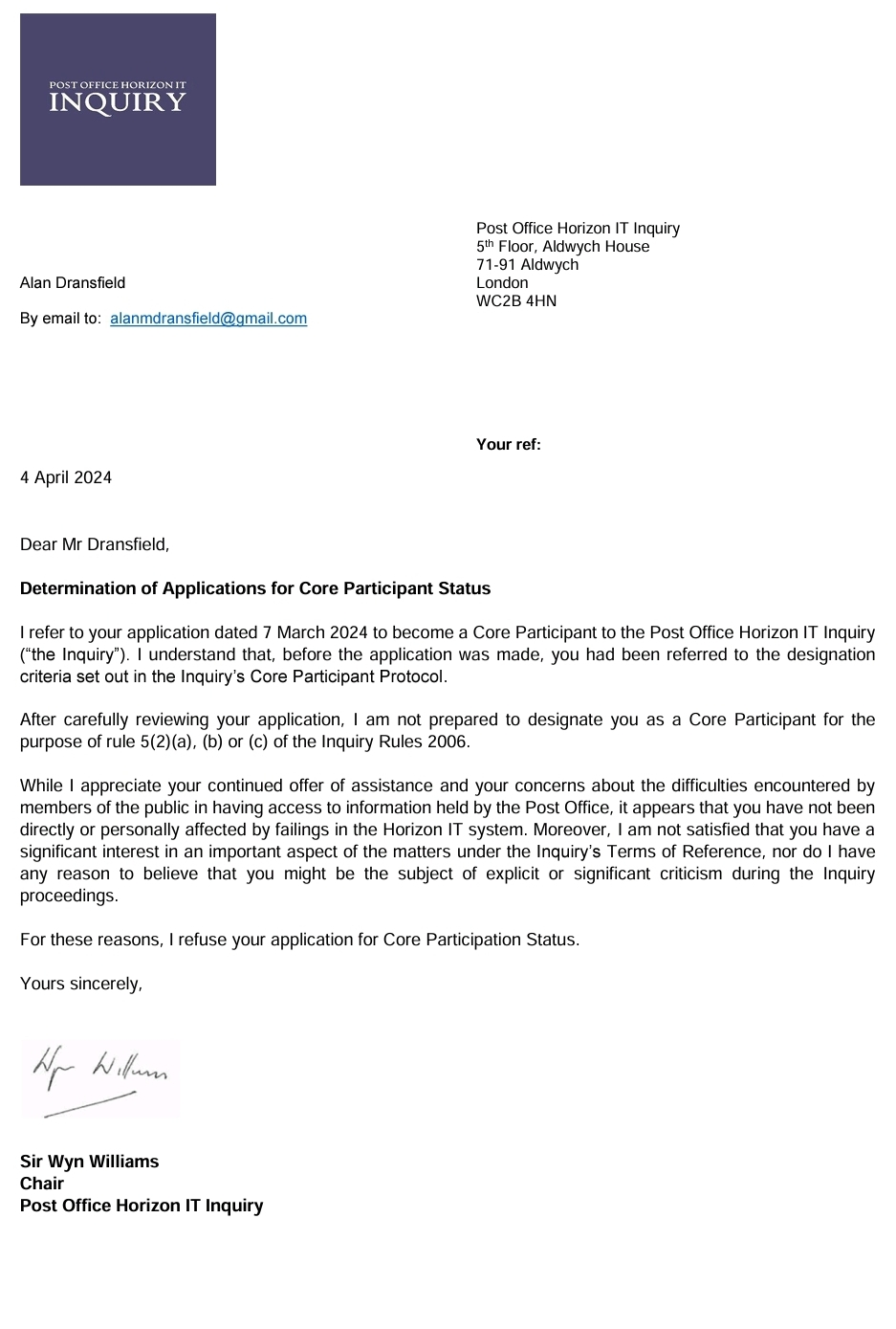 Mr Alan Dransfield is refused core participant status in the UK Post Office Horizon Debacle