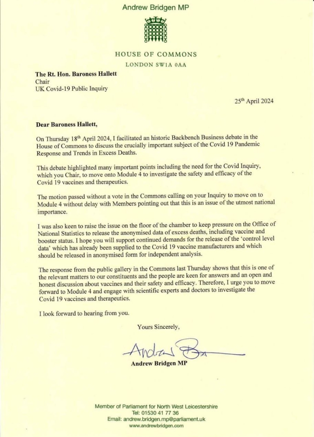 Andrew Bridgen: “I have written to Baroness Hallett, who chairs the @covidinquiryuk, pointing out that a vote in the House of Commons has now called on her to move without delay to Module 4 (investigating the safety and efficacy of MRNA injectables)…”