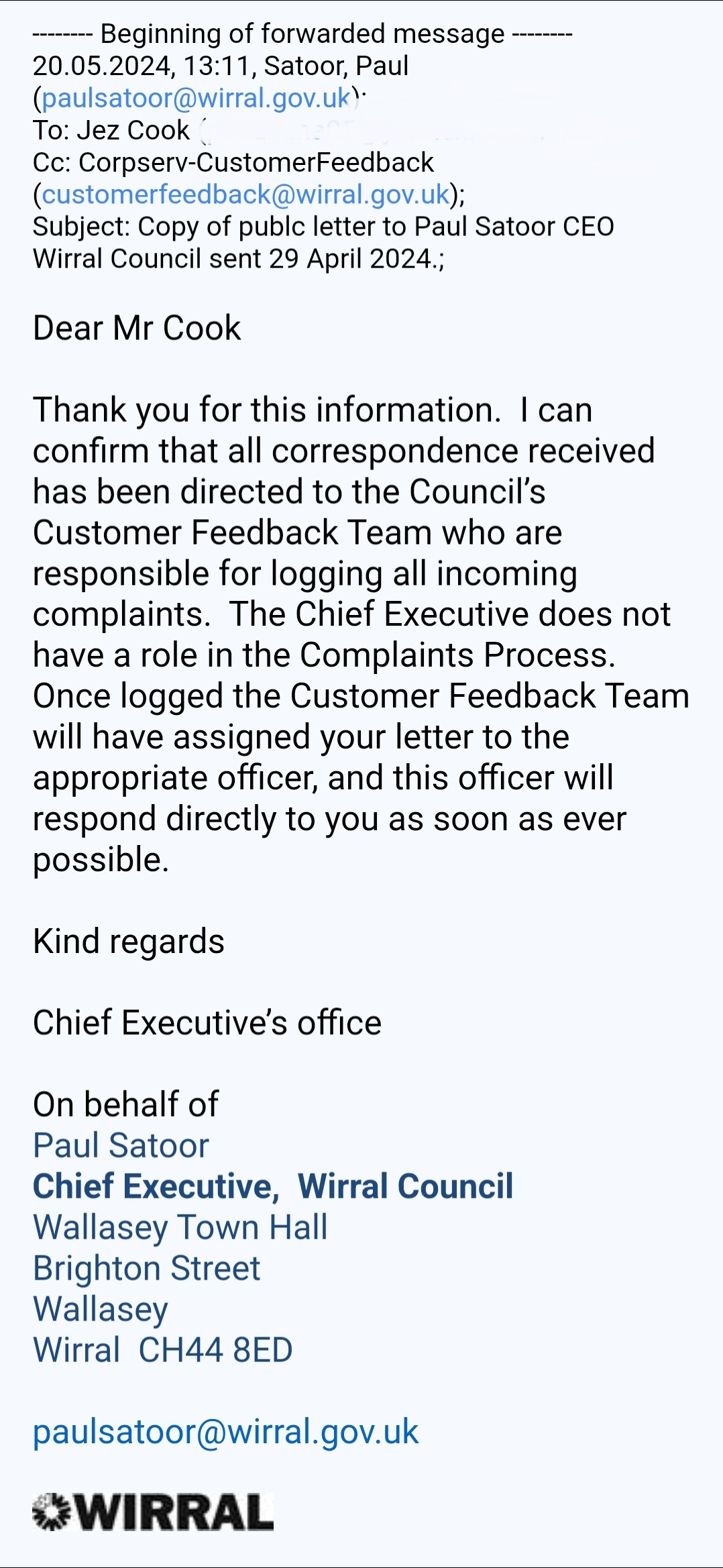 Subject: Copy of public letter to Paul Satoor CEO Wirral Council sent 29 April 2024;