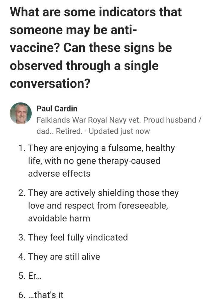 https://www.quora.com/What-are-some-indicators-that-someone-may-be-anti-vaccine-Can-these-signs-be-observed-through-a-single-conversation/answer/Paul-Cardin?ch=18&oid=1477743769905261&share=e9b8f9b6&srid=ulXsr&target_type=answer