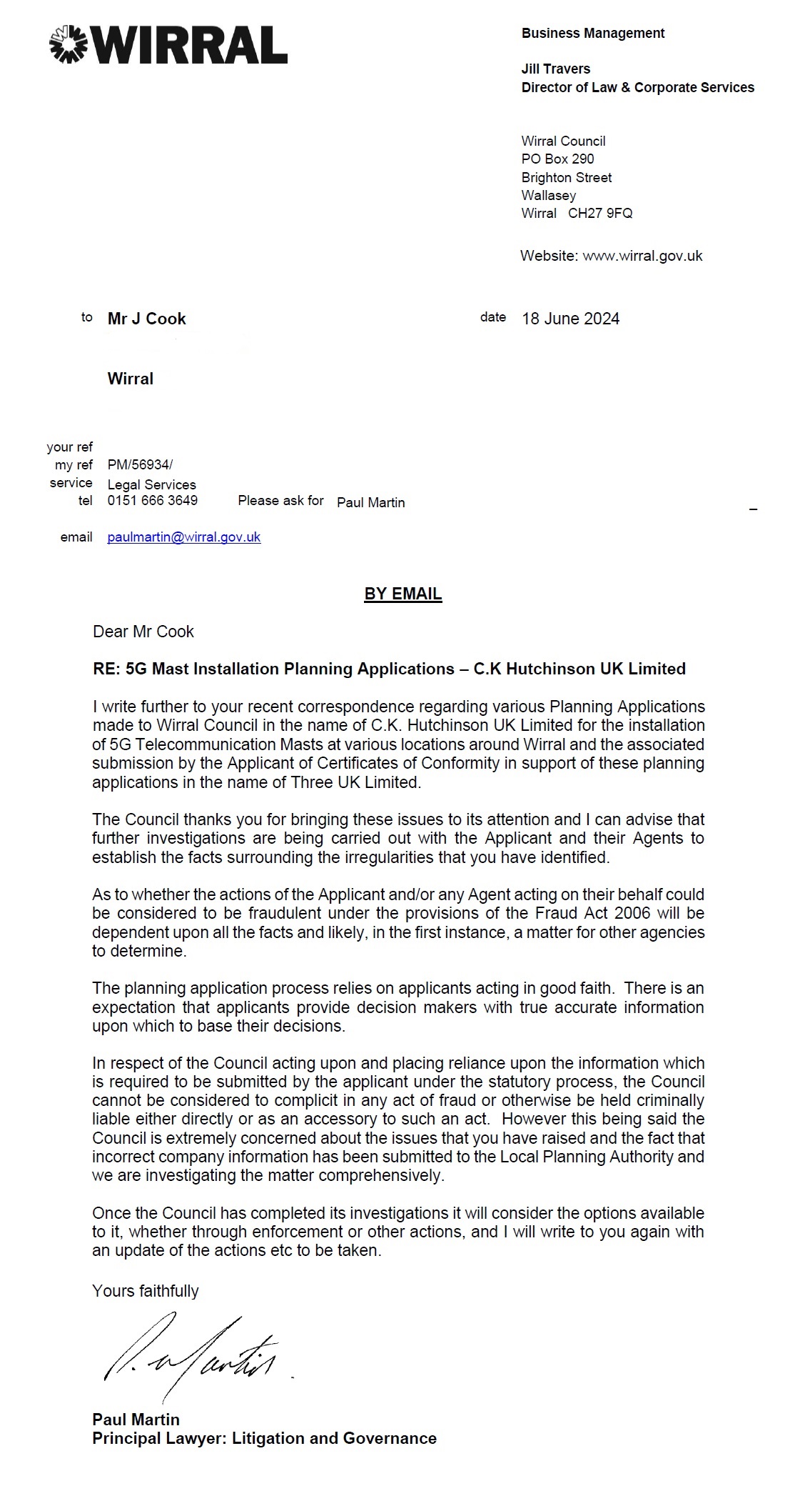 The ‘recent correspondence’ referred to above is the letter before claim sent to Wirral Council CEO Paul Satoor in April 2024. This formed a very detailed account which included a large number of questionable statements of conformity and other dubious documents linked to 5G mast applications.