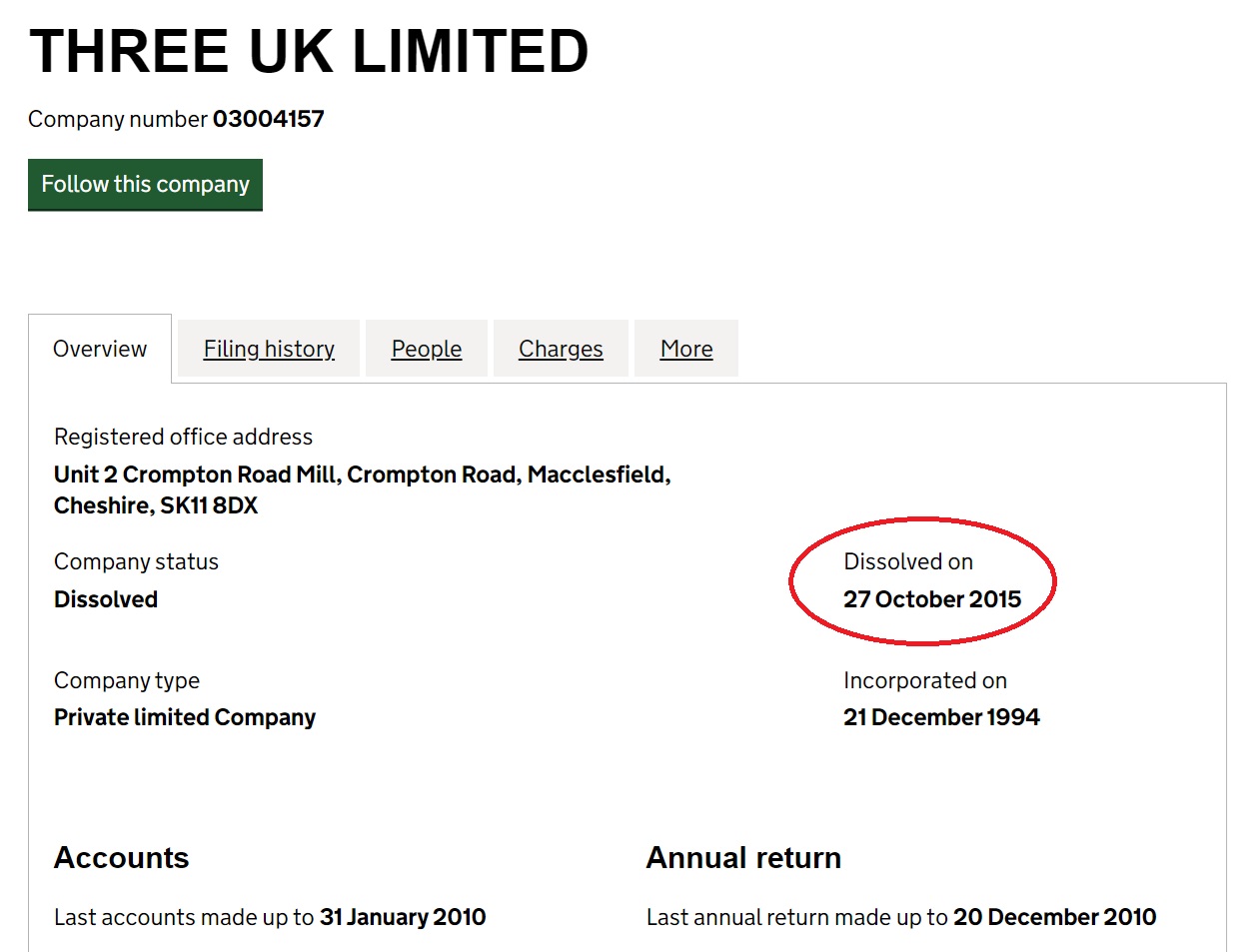 According to the Companies House website, Three UK Limited was dissolved in October 2015, seven years before this conformity statement was issued.