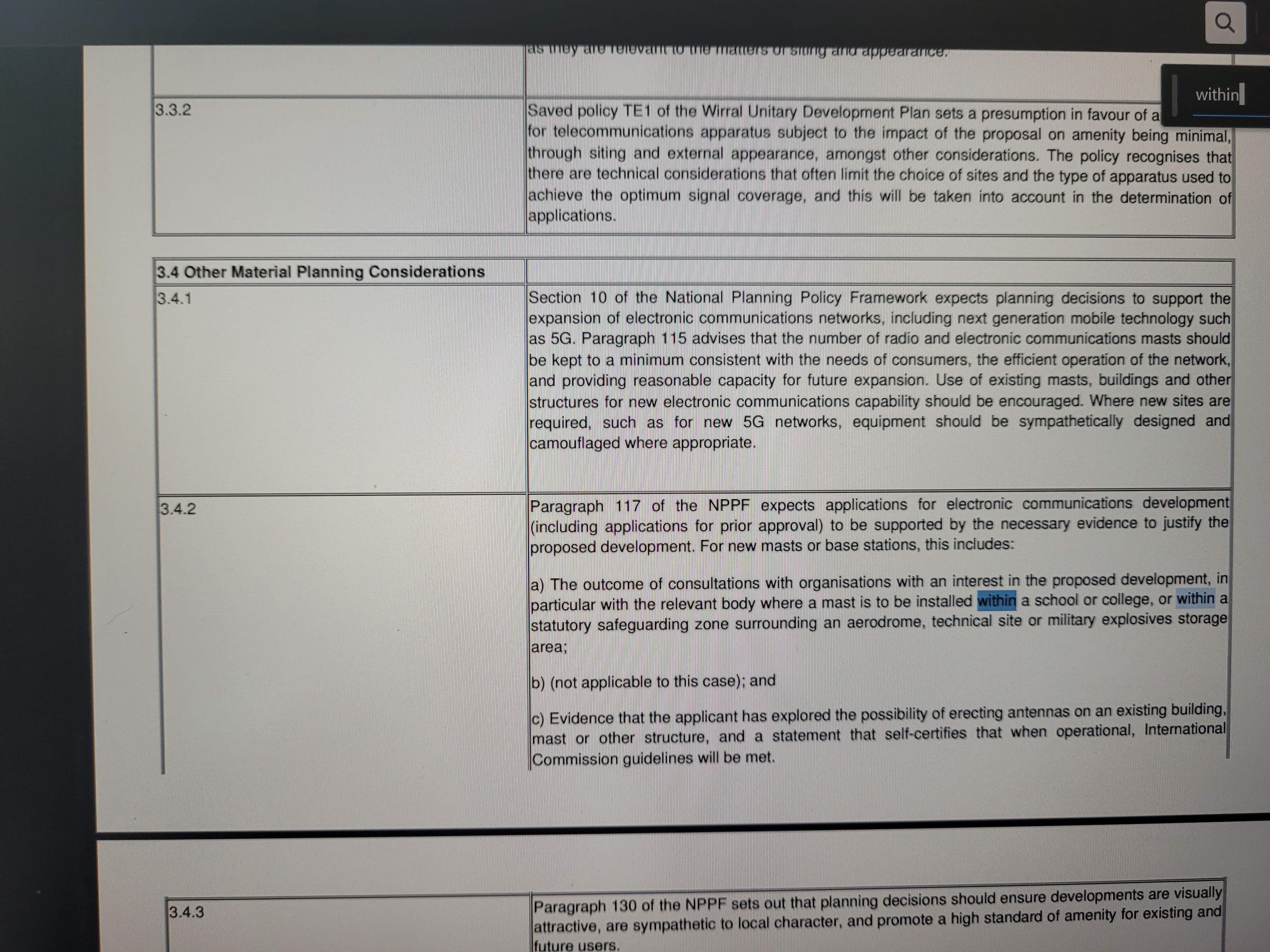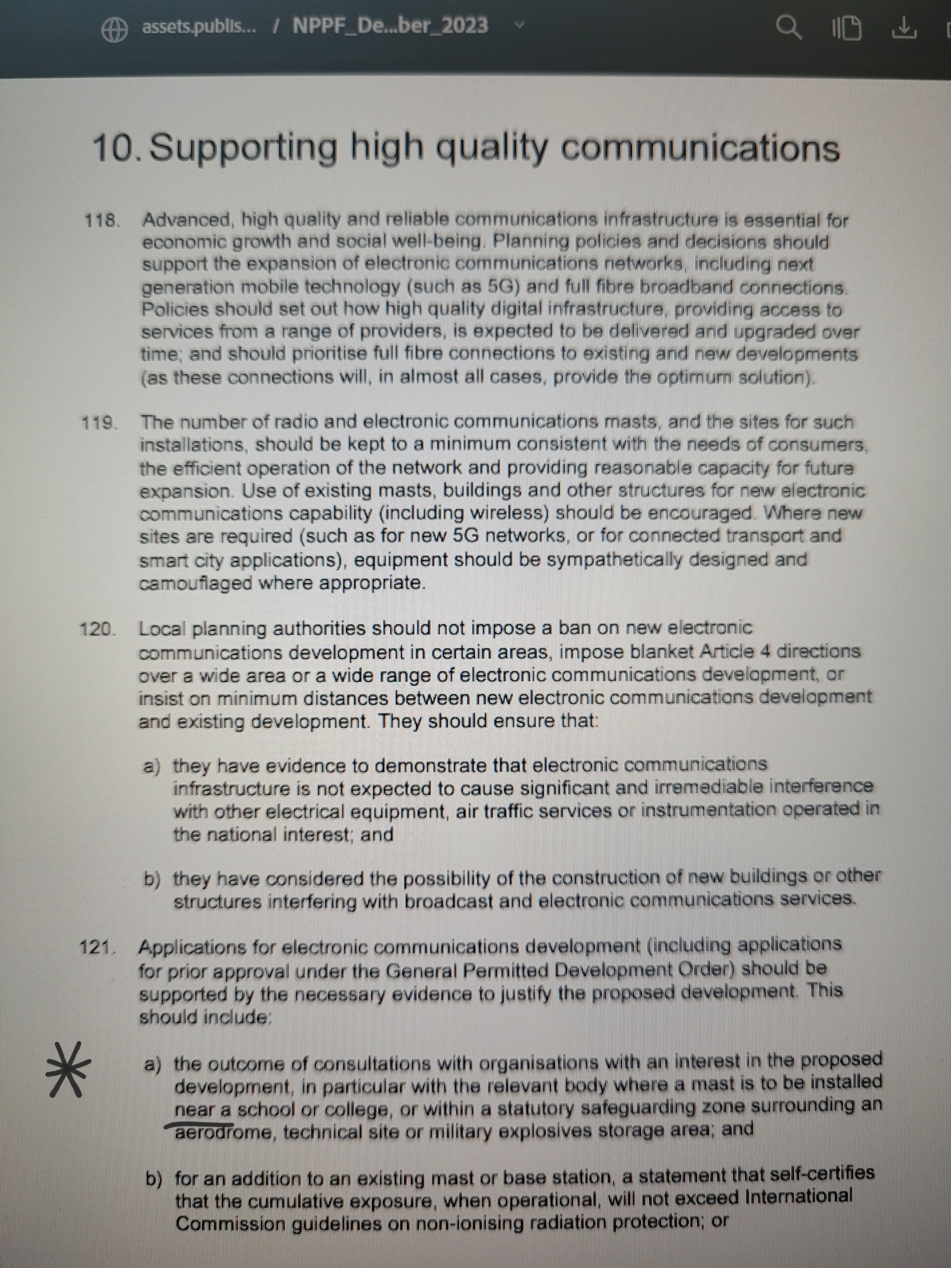 Here is a photograph of the original NPPF wording where the text reads: “where a mast is to be installed near a school or college…”