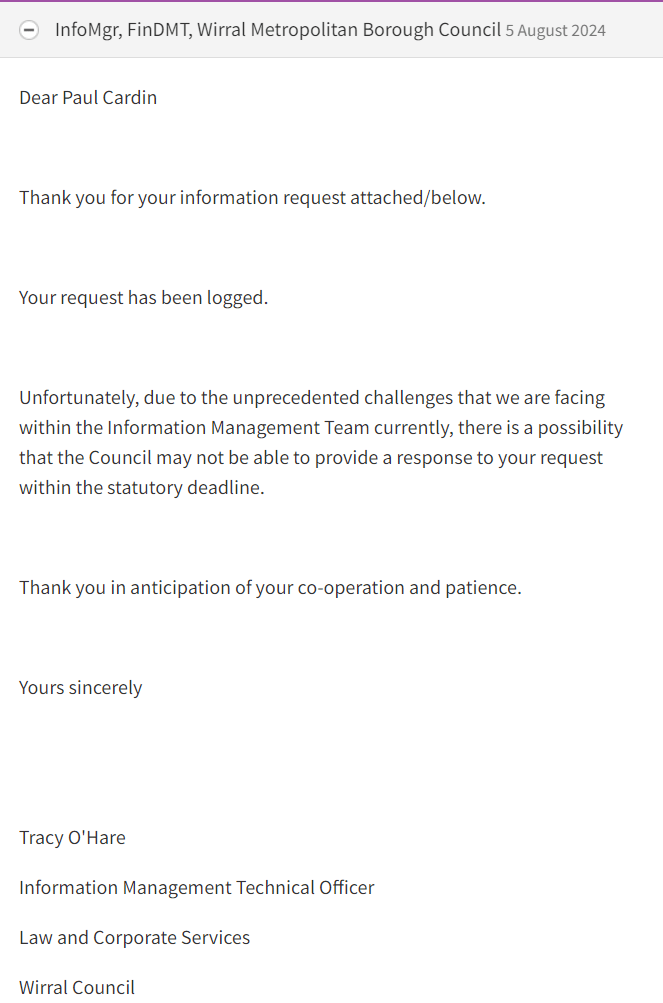 Within UK law, please explain how Wirral Council – as a first response – are justified in announcing that they’re in a position to allow themselves extra time to respond to a Freedom of Information request?
