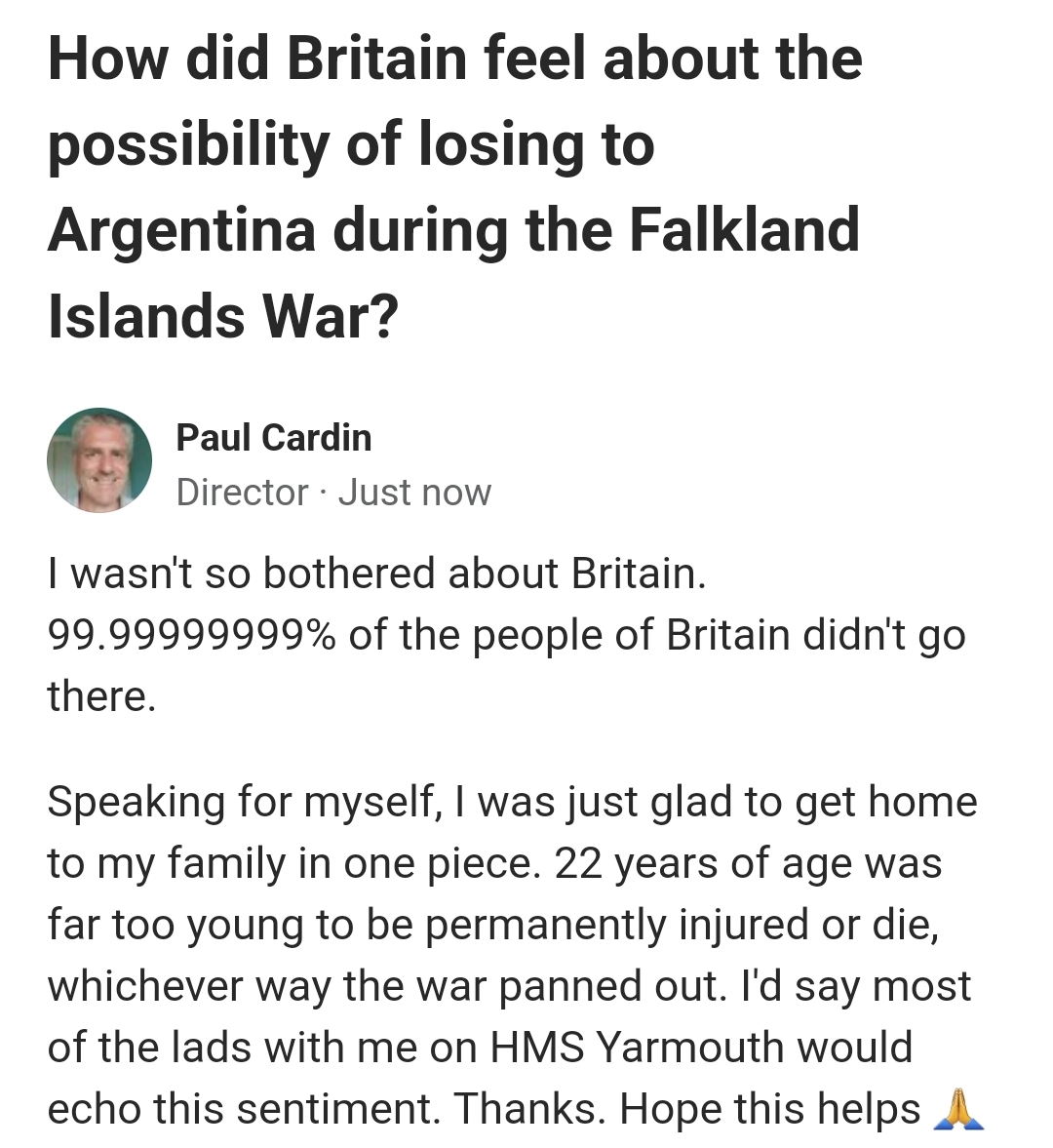 https://www.quora.com/How-did-Britain-feel-about-the-possibility-of-losing-to-Argentina-during-the-Falkland-Islands-War/answer/Paul-Cardin?ch=10&oid=1477743796795284&share=6ae1a6ef&srid=ulXsr&target_type=answer