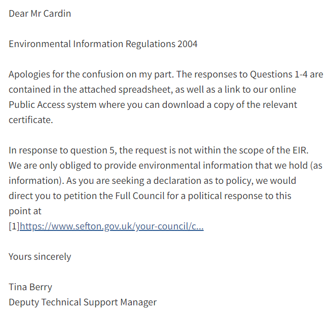 From a total of 16 local council Freedom of Information requests (scroll down) referring to bogus 5G safety certificates, I’ve had the best response from Sefton Council.
