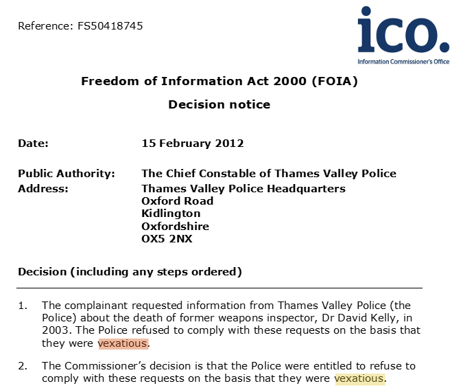Dear UK Public, asking any questions about the death of Dr David Kelly is vexatious, but it will all become available in the year 2073 anyway, so what’s your problem? Yours in the spirit of ‘information freedom’, The Information Commissioner’s Office