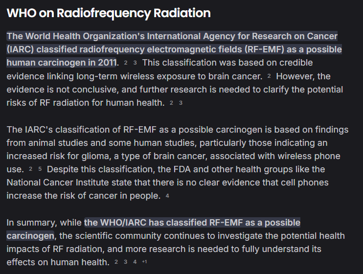 The World Health Organisation’s official position on radio frequency radiation is that it is a potential carcinogen. What does Artificial Intelligence say…?