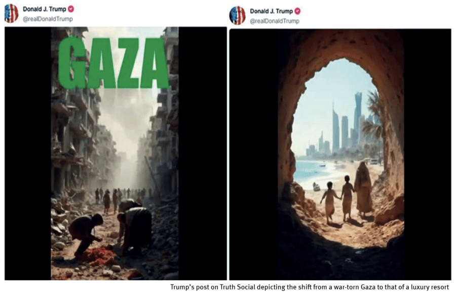 This was, therefore, another illegitimate deal, made between a group promising to exercise the undue influence it had no right to possess, for what the other side categorically did not possess – any rights over the land of Palestine. Britain simultaneously made conflicting promises of freedom and independence to the Arab tribes as long as they rebelled against the Turks and helped Britain gain an advantage over the Ottoman Empire. These were promises Britain had no qualms in breaking. Trump’s post on Truth Social depicting the shift from a war-torn Gaza to that of a luxury resort Trump’s plan to redesign the map of Palestine without Palestinians is the burlesque culmination of the betrayal and treachery perpetrated by the U.S.-AngloIsraeli Empire that is now firmly out of the closet.
