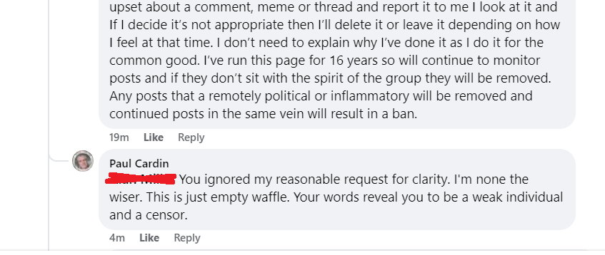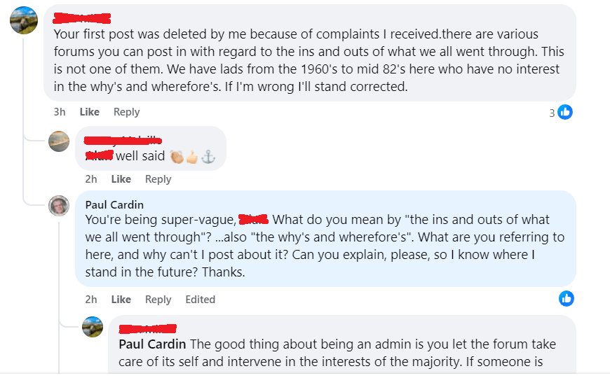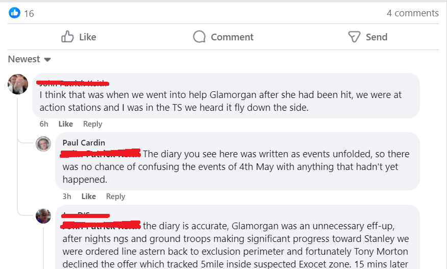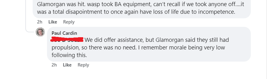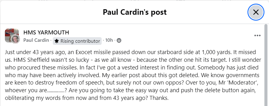 I sent the above blog post to the HMS Mercury, HMS Plymouth, HMS Ganges and HMS Yarmouth private Facebook groups and was surprised to see that the HMS Yarmouth moderator had deleted it. Particularly because my ship HMS Yarmouth had been attacked with Exocet missiles in 1982. The moderator’s feedback and the reason given for doing this was given as follows: