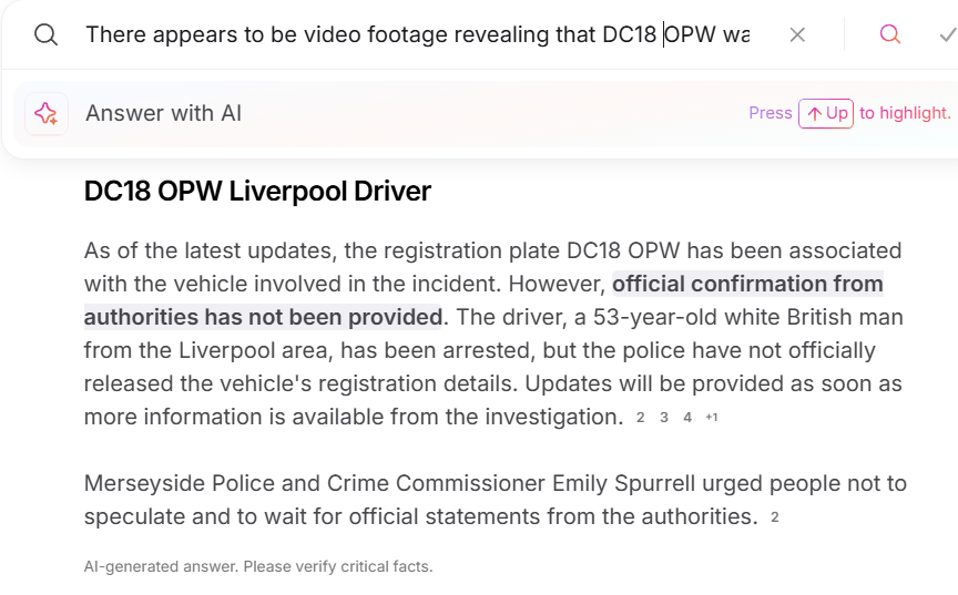 As of 18:18 on 27th May 2025, there is no official confirmation that “DC18 OPW” was the registration plate of the Liverpool driver who ran people over on 26th May 2025