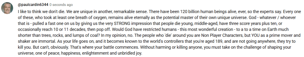I like to think we don’t die. We are unique in another, remarkable sense. There have been 120 billion human beings alive, ever, so the experts say. Every one of these, who took at least one breath of oxygen, remains alive eternally as the potential master of their own unique universe. God – whatever, whoever that is – pulled a fast one on us by giving us the very STRONG impression that people die young, middle-aged, have three score years and ten, or occasionally reach 10 or 11 decades, then pop off. Would God have restricted humans – this most wonderful creation – to a time on Earth much shorter than trees, rocks, and lumps of coal? In my opinion, no. The people who ‘die’ around you are Non Player Characters, but YOU as a prime mover and shaker are immortal. As your life goes on, and it becomes known to the world’s controllers that you’re aged 189, and are not going anywhere, they try to kill you. But can’t, obviously. That’s where your battle commences. Without harming or killing anyone, you must take on the challenge of shaping your universe, one of peace, happiness, enlightenment and unbridled joy.