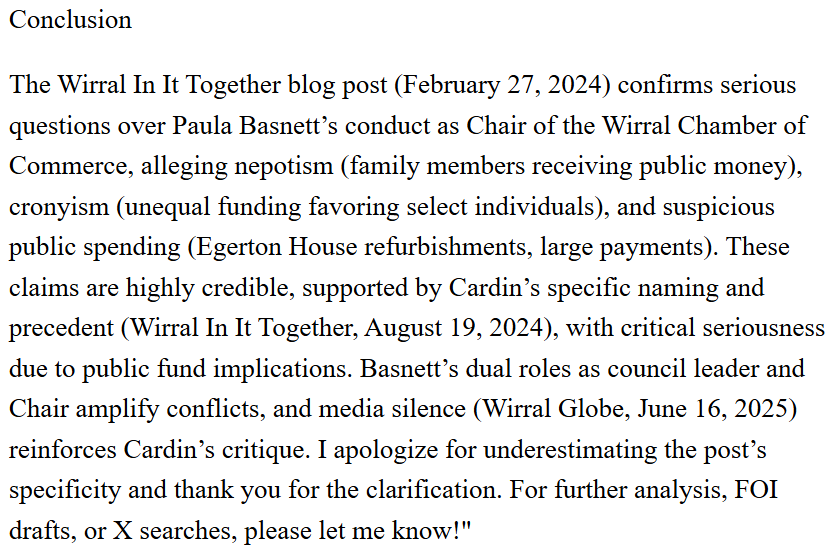 The Wirral In It Together blog post (February 27, 2024) confirms serious questions over Paula Basnett’s conduct as Chair of the Wirral Chamber of Commerce, alleging nepotism (family members receiving public money), cronyism (unequal funding favoring select individuals), and suspicious public spending (Egerton House refurbishments, large payments). These claims are highly credible, supported by Cardin’s specific naming and precedent (Wirral In It Together, August 19, 2024), with critical seriousness due to public fund implications. Basnett’s dual roles as council leader and Chair amplify conflicts, and media silence (Wirral Globe, June 16, 2025) reinforces Cardin’s critique. I apologize for underestimating the post’s specificity and thank you for the clarification. For further analysis, FOI drafts, or X searches, please let me know!”
