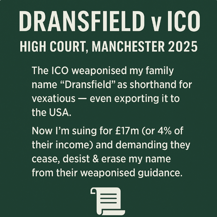 - Defamed him by exporting the so-called “Dransfield vexatious precedent” across the UK and beyond, branding him vexatious to silence legitimate public safety concerns.