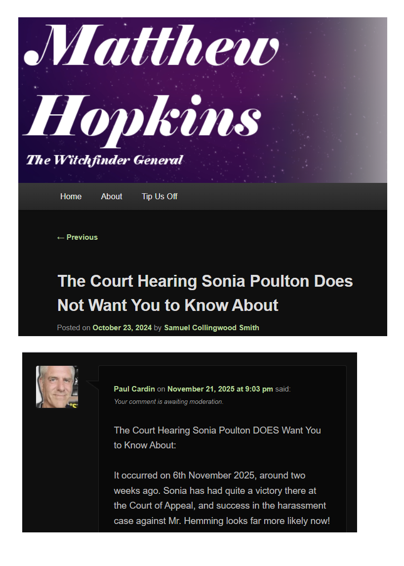 The most recent confirmed judgment is from December 5, 2024, when the High Court dismissed Sam Smith’s (aka “Matthew Hopkins”) appeal against Sonia Poulton. Mr Justice Linden ruled that Smith’s appeal was “misconceived and wasteful of court time,” upheld the original decision allowing Poulton’s harassment claim to proceed, and awarded her 85% of her costs.