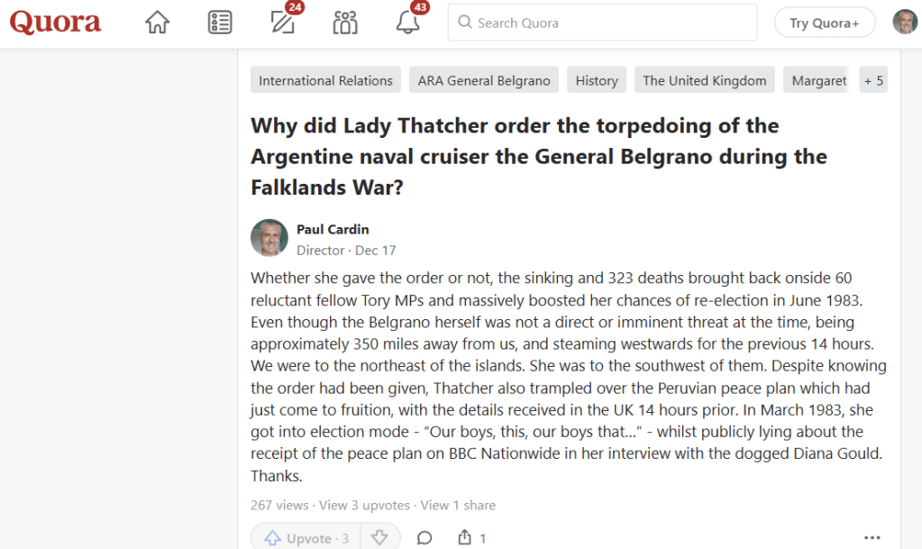 QUORA. Why did Lady Thatcher order the torpedoing of the Argentine naval cruiser the General Belgrano during the Falklands War?