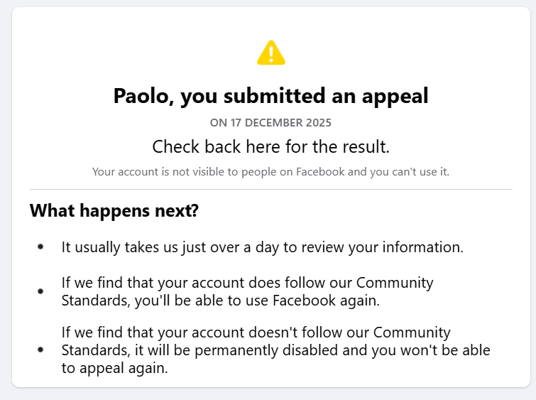 So, I will either be allowed back in or my account will be permanently disabled. Which way will it go?