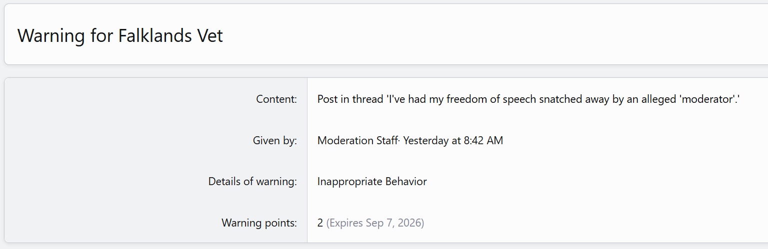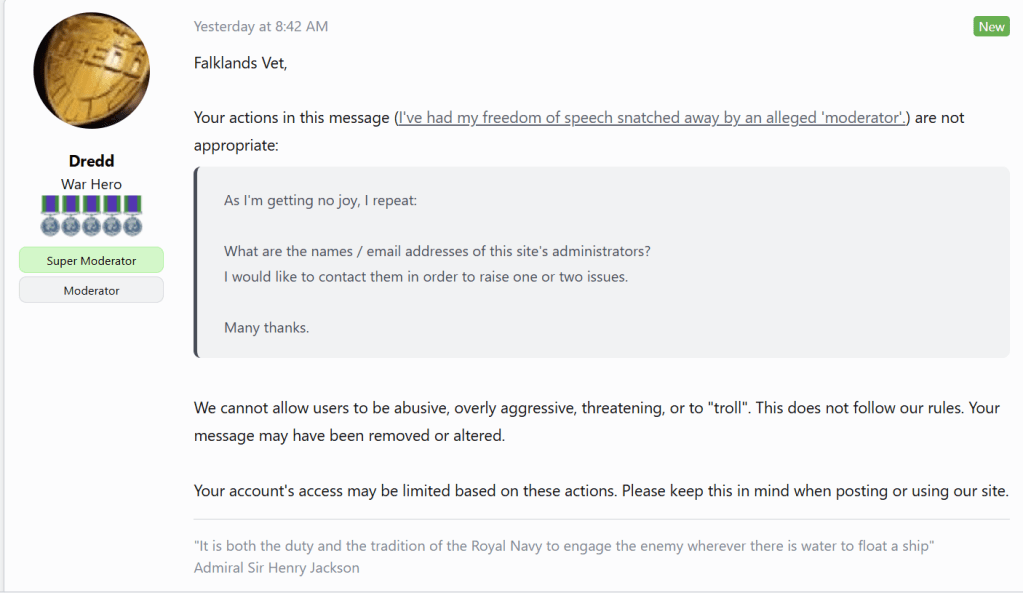 Here’s a direct message I received on 7th March 2026. As you can see, I’m being moderated, labelled as abusive, overly aggressive, threatening and a troll, whereas my anonymous, unnamed abusers are not and appear never to have been moderated.